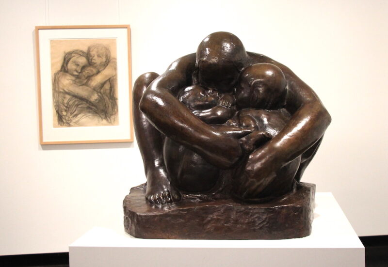 Mutterliebe – ein zentrales Thema von Käthe Kollwitz. Hier einmal als Bronzeplastik (Modell 1932-36, Guss 1984) und als Kohlezeichnung (1932). – Foto: JS