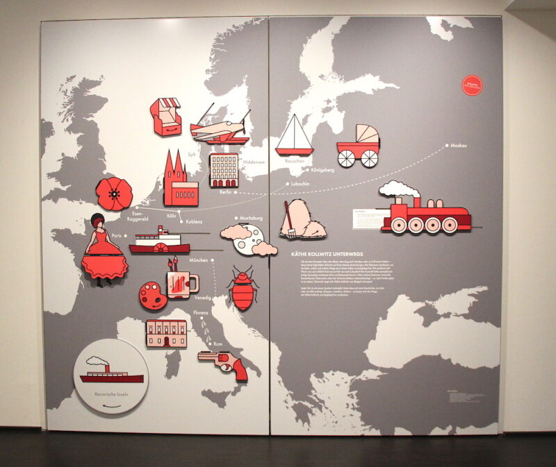 Begleitet wird die Schau von neuen Vermittlungsangeboten. Neben zwei Filmen etwa eine Vitrine mit einem Überblick über die von Kollwitz genutzten Drucktechniken. Ein „Plakatomat“ lädt über einen Bildschirm als Leinwand zu eigenen künstlerischen Entwürfen ein. Ein Höhepunkt ist die über eine Wand ausgebreitete Reise-Biografie von Käthe Kollwitz (1867-1945), angereichert mit kleinen den meisten wohl unbekannten Anekdoten. Etwa dass sie als junge Studentin 1904 auf einer Rundreise durch Italien einen Revolver zum Selbstschutz mit sich trug und sie und ihre Begleiterin unter Kakerlaken im Hotelbett litten. Oder dass ihr 1927 bei einem Besuch mit ihrem Ehemann in Moskau Geld gestohlen wurde und sie mit einer geliehenen Hose zurück nach Berlin reisen musste.