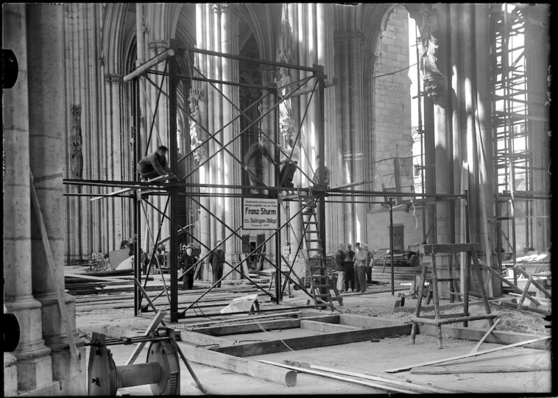 Da ist zum einen die Geschichte der lange vergessenen Fotografin. Margarita Neiteler (1913-2002) hatte von den 1940er bis 1960er Jahren als Röntgenschwester im Krankenhaus Hohenlind gearbeitet. Die Ordensschwester kannte sich also mit der Fotografie-Technik aus, was sich wohl auch bis in die Domverwaltung herumgesprochen hatte. So erhielt sie nach 1945 den Auftrag, die Zerstörungen durch 14 Sprengbomben und den Wiederaufbau des Doms zu dokumentieren.