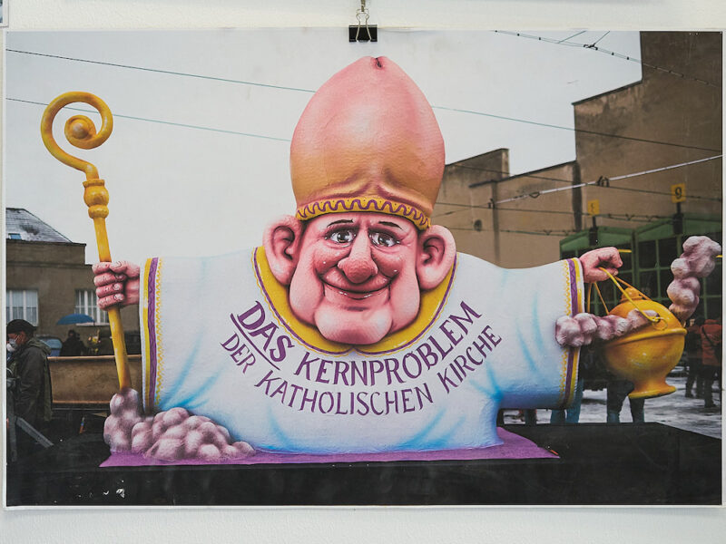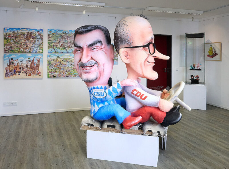 Die Heimbacher Ausstellung bietet Einblick in seine reale Phantasiewelt. Frech, pointiert und humorvoll hält er seinen Zeitgenossen den Spiegel vor. Und es wimmelt nur so von Anspielungen auf Politik, Kirche und Kultur. Köstlich. Und vor allem mutig. Über 70 große Farbfotos dokumentieren sein Schaffen für den Düsseldorfer Rosenmontagszug, erstmals 1990, dann jährlich ab 2000. Selbstherrliche Politiker sind sein Lieblingsziel: Donald Trump, Xi Liping, Emmanuel Macron, Marcus Söder, Sarah Wagenknecht, „Hohlav“ Scholz – und natürlich immer wieder Wladimir Putin.